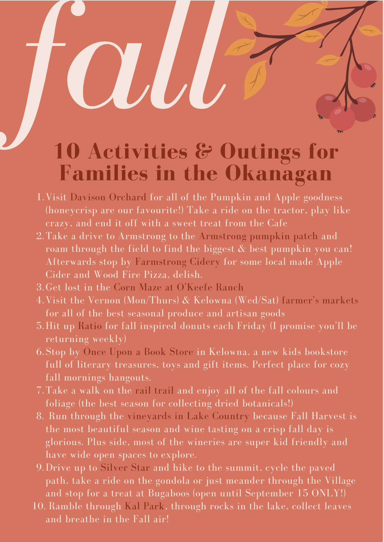 The most wonderful time of the year! Christmas is great and all, but there’s something about Fall that resonates with me. If I could live where it was Fall, 2.5 seasons a year I would be there (I still am partial to a great summer and some good ski days). There’s something about the cool crisp air, a certain smell, the changing colours and, who can say no to sweaters, boots and hats! One of my favourite things about living in the Okanagan is being able to experience four true seasons, each one so great in it’s own way.